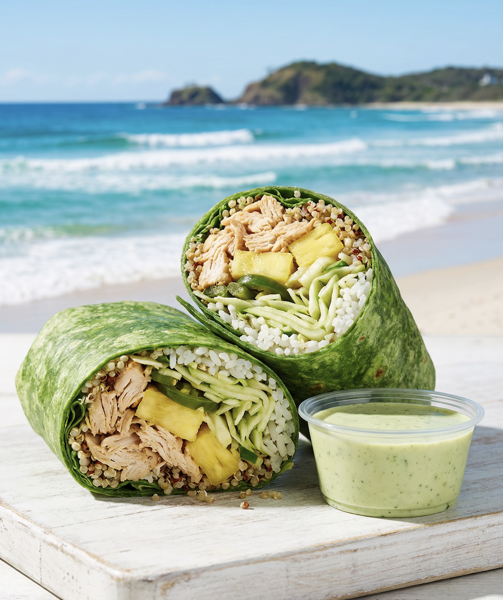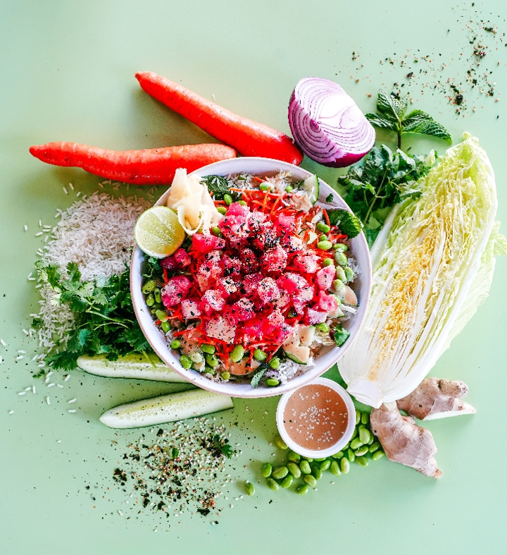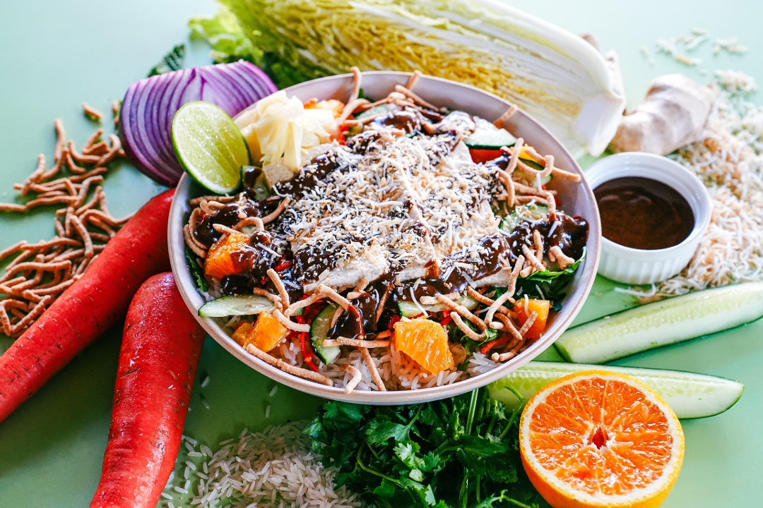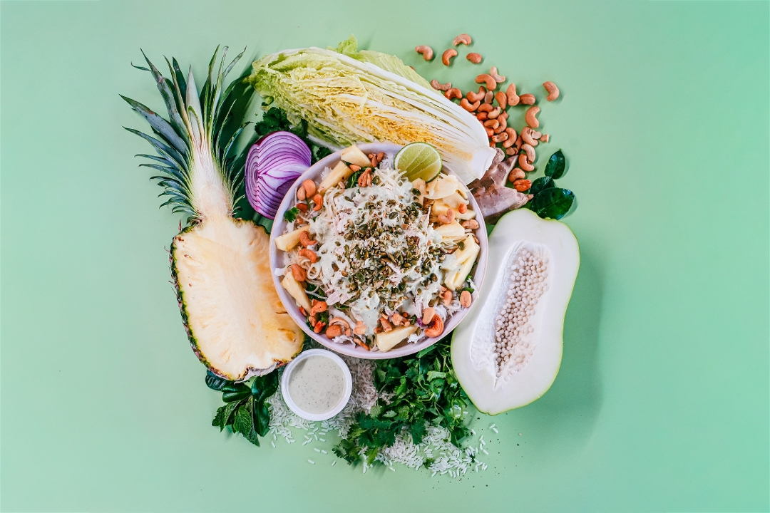 Choice of Chicken or Tofu, Pineapple, Green Papaya, Red Quinoa, Cilantro Red Onion, Warm Jasmine Rice, Napa Cabbage, Spinach Tortilla