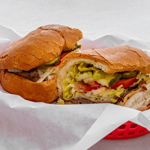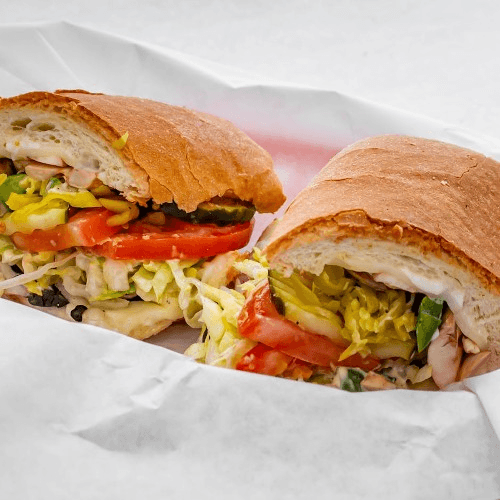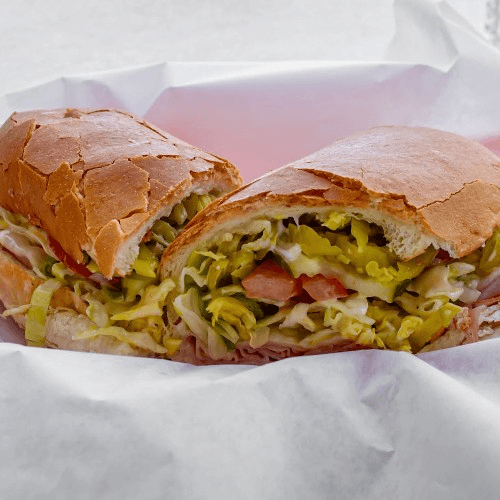 Romaine, and iceberg lettuce, tomatoes, olives, pickles, pepperoncini, mozzarella cheese