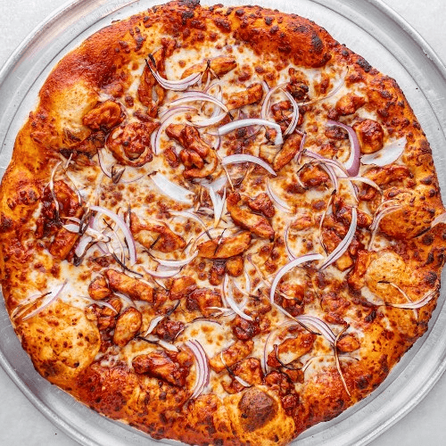 BBQ sauce, chicken, mozzarella cheese, red onion