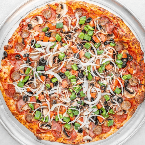 Canadian bacon, Italian sausage, pepperoni, black olive, mushroom, fresh tomato, green pepper, onion