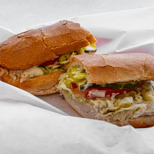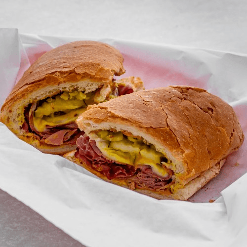 Melted mozzarella, mustard, pickles, pepperoncini
